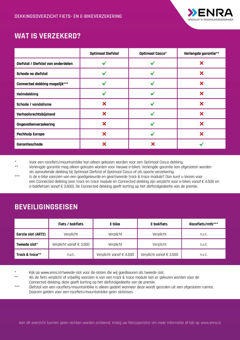 Met de ENRA Fietsverzekering verzekert u uw nieuwe of gebruikte fiets én uw helm. Ook accessoires zijn eenvoudig mee te verzekeren en uw fiets is wereldwijd verzekerd. Uw nieuwe fiets verzekert u rechtstreeks via deze website of via uw fietsspecialist. Een gebruikte fiets verzekert u alleen via uw fietsspecialist.