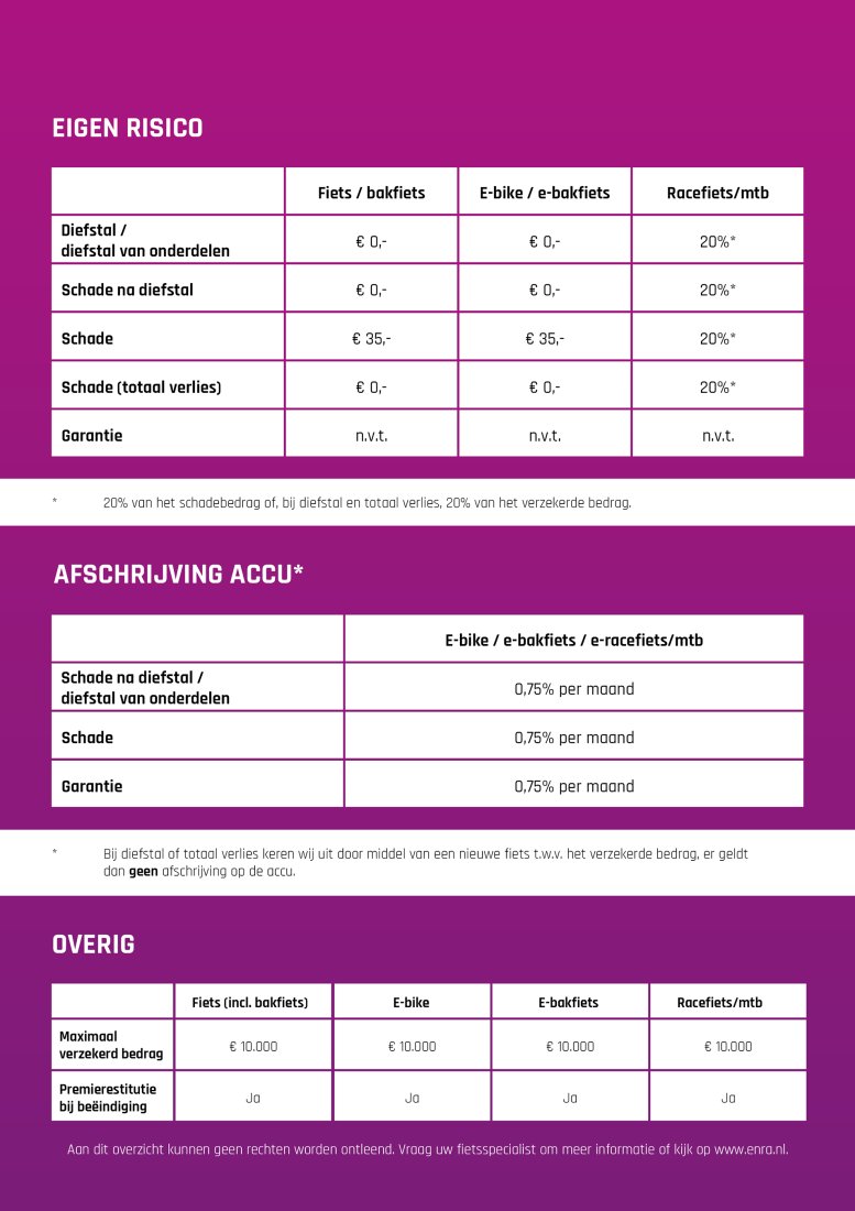 Met de ENRA Fietsverzekering verzekert u uw nieuwe of gebruikte fiets én uw helm. Ook accessoires zijn eenvoudig mee te verzekeren en uw fiets is wereldwijd verzekerd. Uw nieuwe fiets verzekert u rechtstreeks via deze website of via uw fietsspecialist. Een gebruikte fiets verzekert u alleen via uw fietsspecialist.